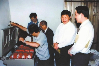 一九九六年蒲月,時任福建省委副書記習近平在長汀縣觀察精制茶葉加工場。